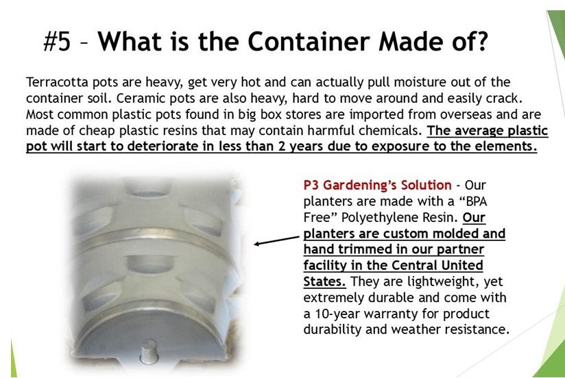 100% Made in the USA of “BPA Free” Materials. Most Durable and Long Lasting Planter You Will Ever Own!
